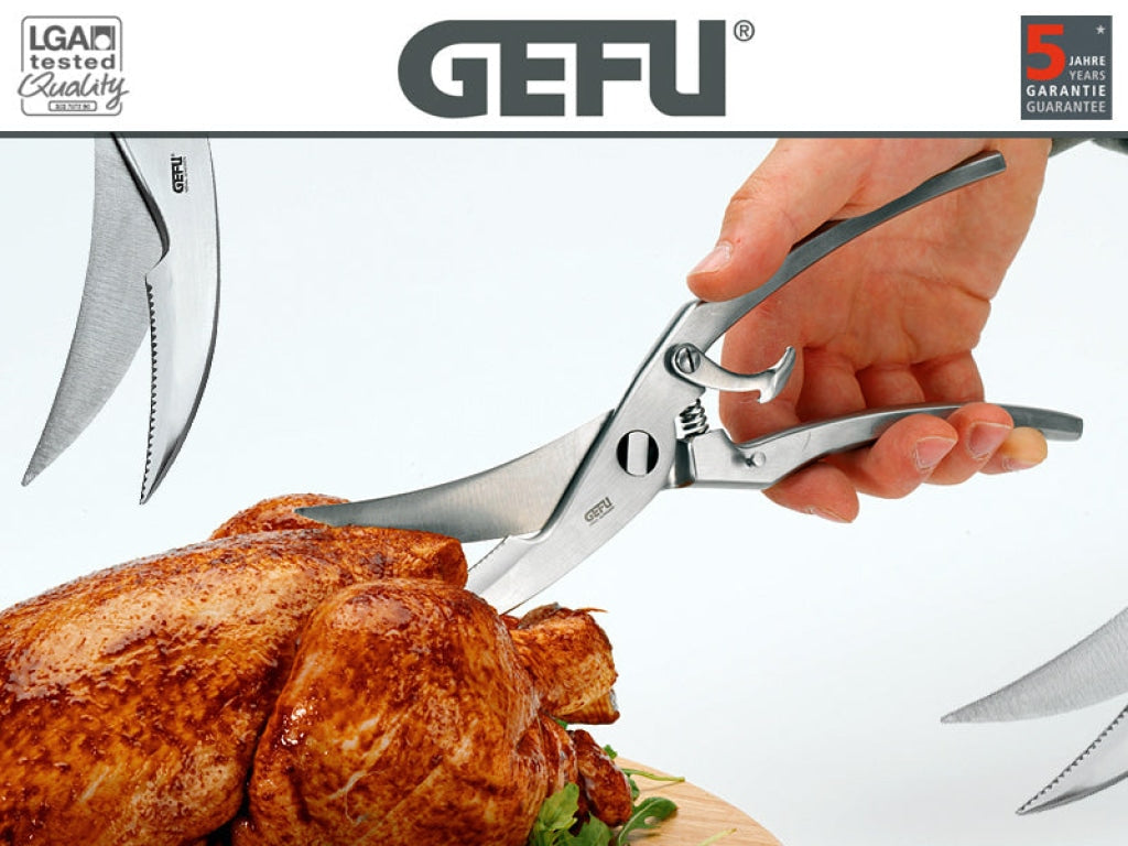 Denne saks er GEFUs topmodel og er fremstillet i rustfri stål. Fjerkræsaksen kan skilles i to dele, når den skal rengøres.