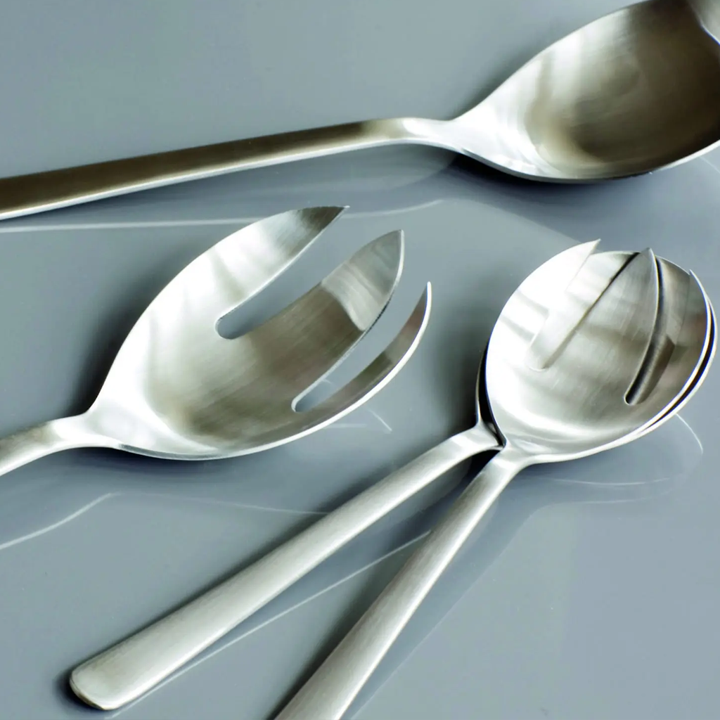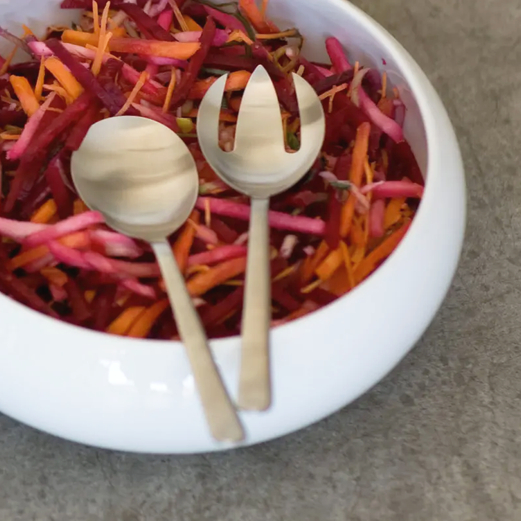 Kay Bojesen står for tidløst og æstetisk design. Han ønskede ikke at skabe et modepræget bestik, som kun var smukt at kigge på, men derimod ville han skabe et perfekt spiseredskab, der var funktionelt og vedvarende. Hver del er formgivet ud fra funktion i milde og harmoniske former. Det lille salatsæts bedre halvdel, men også god alene som serveringsske - den er nemlig uovertruffen til kartofler og andet lunt i fad og skål.