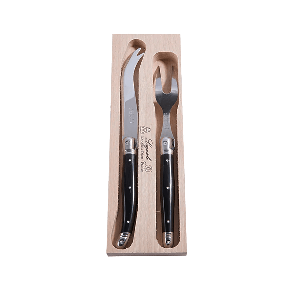 Klassisk ostesæt fra Debutant serien af franske Laguiole i hærdet rustfrit stål og spejlslebet finish med sort skaft i ABS, og med den traditionelle bi i rustfrit stål som støttepude til pegefingeren, når du skærer med det. Sættet består af en ostekniv til hård ost og en ostegaffel.