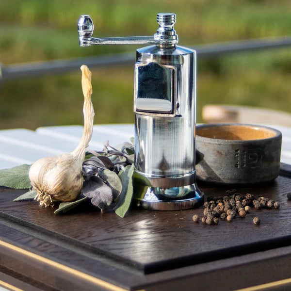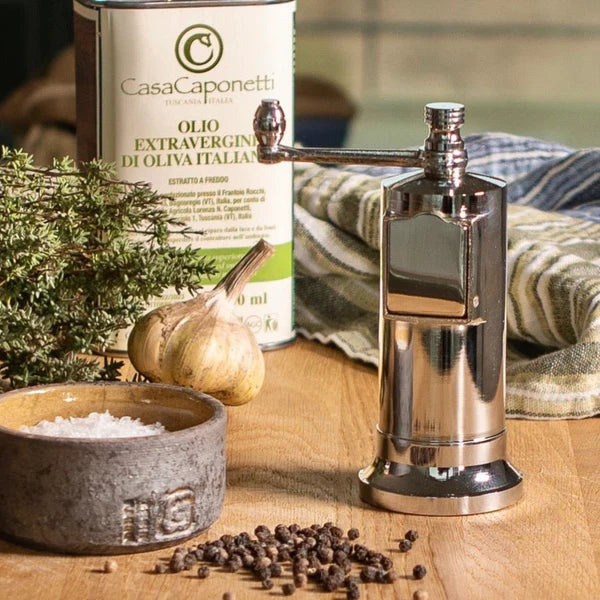 Peberkværn i blankt forkromet messing. H: 13 cm, Ø 4 cm.