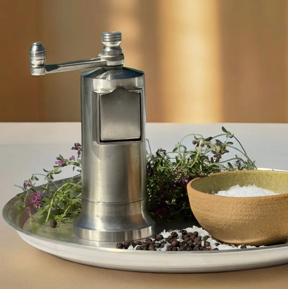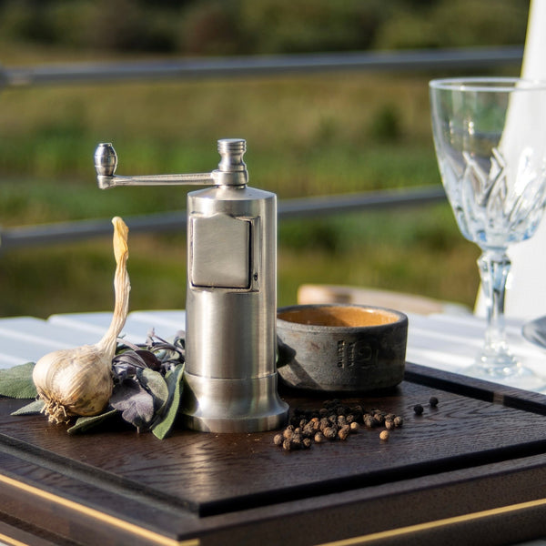 Peberkværn i forkromet messing. H: 13 cm, Ø 4 cm.